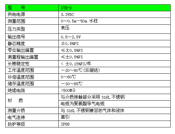 STH-D型低功耗液位傳感器是利用液位高度與壓力正比的關系,利用壓力檢測液位高度的變送器。 傳感器部分采用擴散硅敏感芯體,有穩(wěn)定性和可靠性,精度可選,過載壓力等特點,適合測量各種與316不銹鋼兼容的介質(zhì)。應用于消防、水泵、水處理系統(tǒng),海洋勘測述,水文監(jiān)測等。